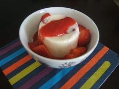 Trocear 6 fresas y añadir al helado, repartir en recipientes individuales (yo usé flaneras desechables), tapar con film transparente y congelar al menos durante 6 horas.