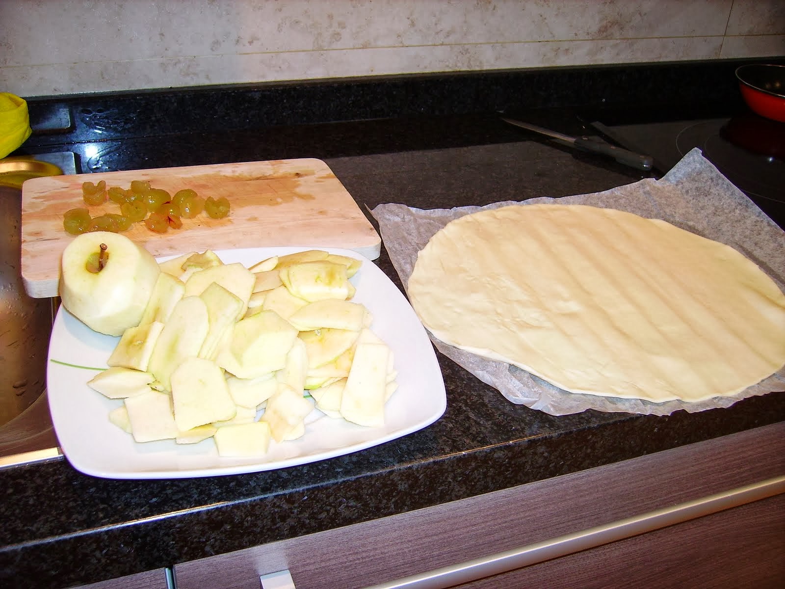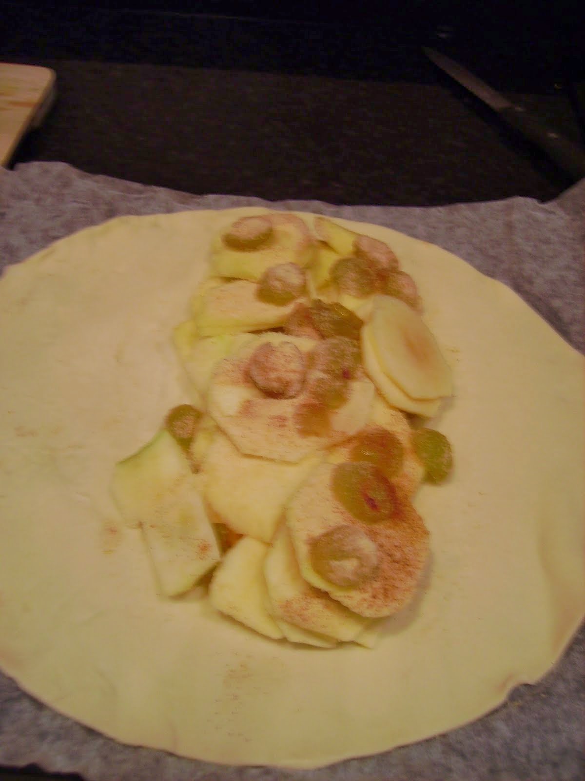 Ponemos las manzanas y las uvas encima del hojaldre. Espolvoreamos la canela (y si os gusta muy dulce podéis ponerle un poco de edulcorante en polvo, aunque personalmente no lo encuentro necesario).