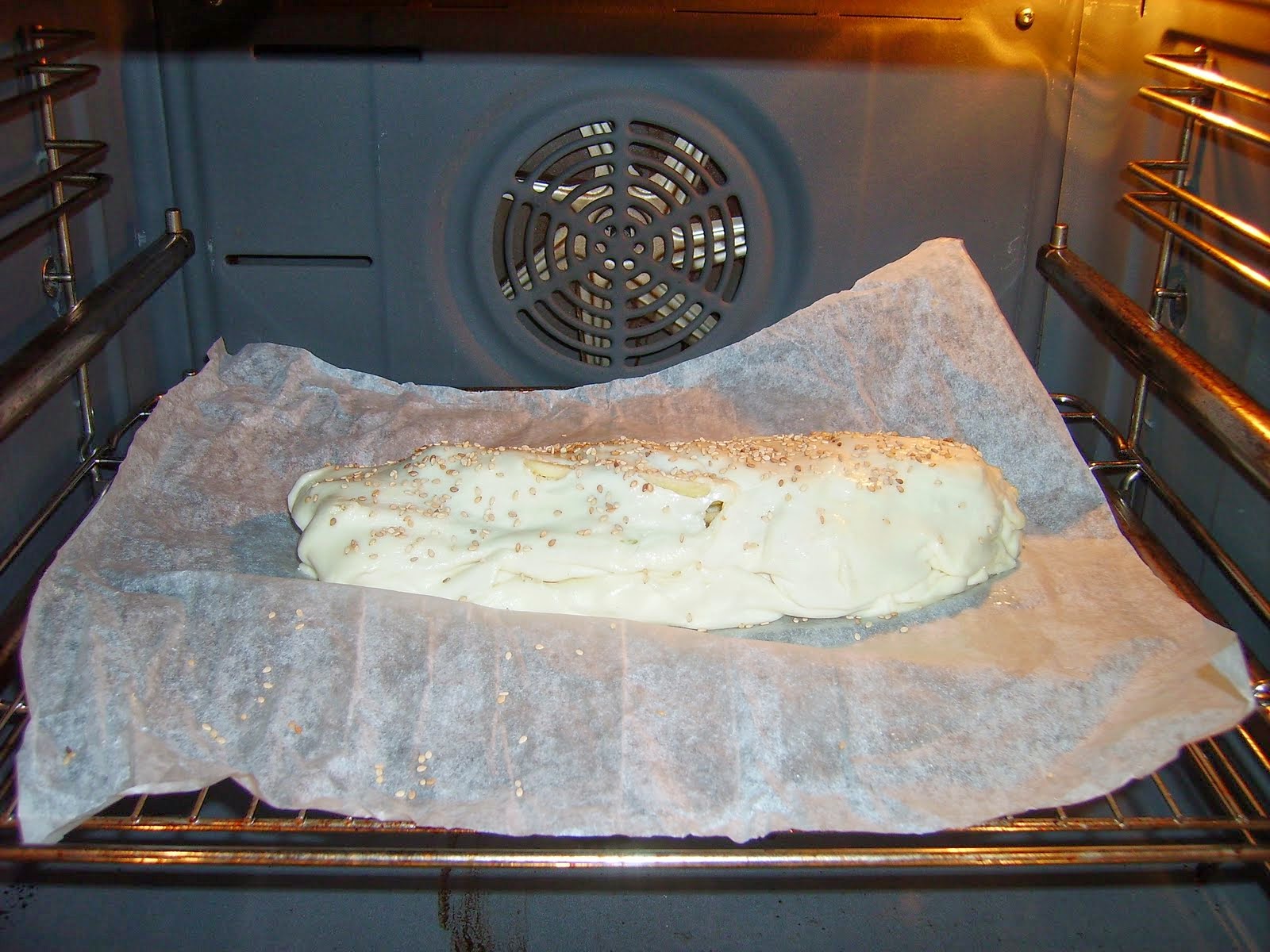 Cerramos el hojaldre con cuidado que no se rompa y sellamos los bordes. Con un pinzel le ponemos un poco de mantequilla derretida (te puedes ayudar con el microondas) (o bien yema de huevo) y le tiramos uns semillas de sésamo.