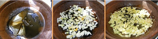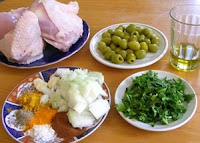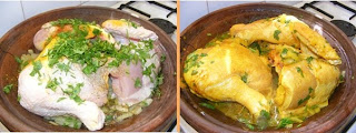 Frotamos el pollo troceado con un diente de ajo. En una olla o en el tajine ponemos 3 cucharadas de aceite y hacemos la cebolla con los dientes de ajo.