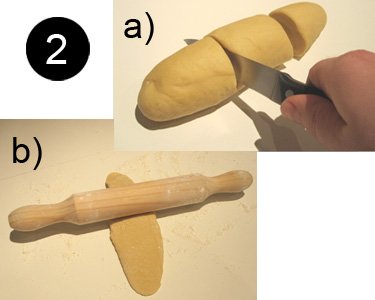 2) Sacamos la masa del frigorífico después de 1 hora y la amasamos encima de la mesa y la cortamos en tres trocitos. Ahora vamos a trabajar cada uno de los tres trozos de masa. Es muy importante que enharinemos bien la mesa donde vamos a trabajar porque la masa puede pegarse y es muy incómodo trabajarla. Con un rodillo vamos estirando el trozo de masa hasta que quede lo más fino posible.