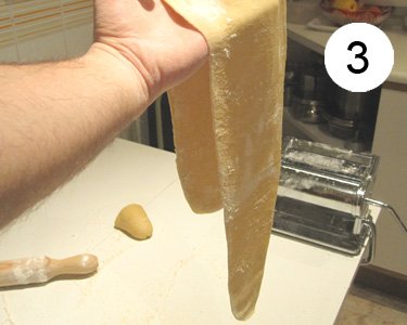 3) Una vez hayamos pasado por el rodillo la masa, debemos introducirla en la máquina de pasta varias veces (entre 4 y 6 veces) para que se quede lisa, tal y como se muestra en la foto 3. Mi máquina tiene 9 posiciones y suelo utilizar la posición 1 para que la masa quede lo más fina posible. No se os olvide enharinar la mesa cada vez que paseis la masa por el rodillo para que no se pegue.
