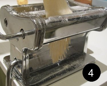 4) Con la masa estirada en la mano, introducimos la masa en la parte posterior de la máquina para cortar la masa. Debes hacerlo de forma rápida para que corte bien y debes estar atento para que no se enrede demasiado y se quiebren los tallarines.