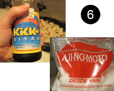 6) El Siyau Kikko y el Ajinomoto son dos ingredientes fundamentales en este plato. Siyau Kikko es una salsa de soja peruana que venden en tiendas de alimentación latinas, no lo encontrareis en tiendas orientales. Para mi gusto y después de muchas pruebas con muchas salsas de soja: Heinz, Man Fong e incluso Kikkoman, el mejor resultado lo he obtenido con el Siyau Kikko “Lo hace más rico” jajaja que locos están los peruanos. Siyau es la palabra en chino cantonés (esto lo he visto en la wikipedia) que significa “salsa de soja”.