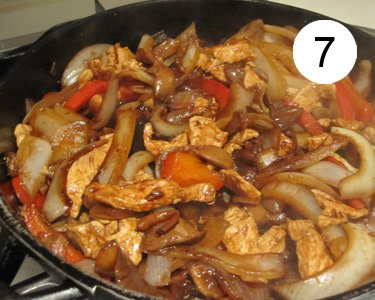 Al final del todo, echa la cebolla partida en tiras gruesas y dejala cocinar hasta que se ponga transparente. Entonces debemos verter media taza aproximadamente de Salsa de Siyau o Salsa de Soja, pero NUNCA encima del pollo o los ingredientes. Debes hacer un hueco en medio de la sartén y dejar que se fría un poco la salsa de Siyau o Soja. Esto se hace para que pierda su fuerza y adquiera mejor sabor. Tras 10 o 20 segundos de cocinar la salsa, podeis mezclar con todos los ingredientes y quedará algo parecido a la imagen 7. En este punto debeis probar la cebolla y el champiñón para controlar el punto de cocción. Se puede echar toda la salsa de Siyau o Soja que querais para que el pollo y la cebolla se vuelvan de color marrón oscuro.
