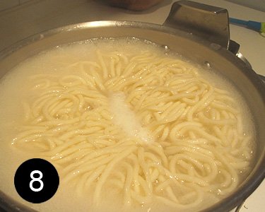 Ey! ¿Se te habían olvidado los tallarines a que si? Pues debes ponerlos a hervir en gran cantidad de agua durante al menos 12 minutos. Aunque algunas recetas que he encontrado en internet dicen que la pasta fresca se cuece en menos minutos que la seca, he descubierto que el mínimo de cocción para que la textura de la pasta fresca sea agradeble, debe ser  de al menos de 12 minutos.