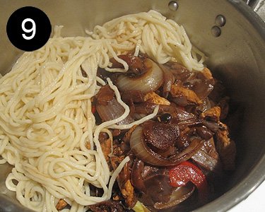9) Una vez se hayan cocido nuestros tallarines, los mezclamos en una olla con la mezcla de pollo y pimiento y verdura de la sartén. En este momento debemos mezclarlo con cuidado todo para que no se deshagan los tallarines y debemos probarlo. Puede suceder que estén sosos, pues se le echa un poco de sal, o que tengan mucha agua debajo a causa de los champiñones, se le retira el agua. Se le puede añadir un poco más de salsa de Siyau y un toque final de media cucharadita de café de Ajinomoto.