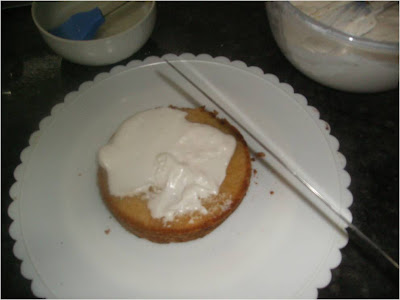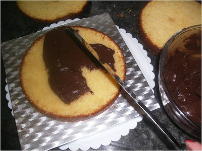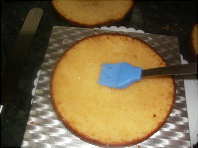 Cortamos el bizcocho en discos, y emborrachamos de almíbar y le damos una capa del glaseado, tapamos y volvemos a mojar con el almíbar el siguiente dico y capa de glaseado, para terminar cubriendo todo el bizcocho por todos los lados con la glasa y cubrir con el fondant