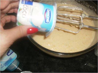 Seguidamente le añadimos el yogur y medio y seguimos batiendo