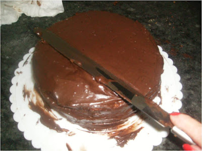 Capa de bizcocho, almíbar y glaseado terminando por cubrir todo el bizcocho por fuera