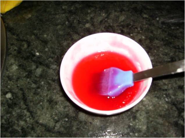 - Con un poco de almíbar de emborrachar el bizcocho deshacemos un sobre para dar brillo a la tarta una vez acabada, es una especie de gelatina, le podemos poner unas gotas de colorante.