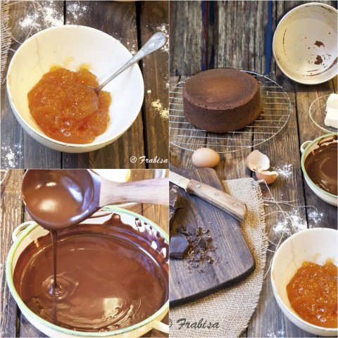 – Corta el bizcocho en tres en el sentido del grosor. La primera y última capa las cubres con ganache, y la capa del centro con mermelada de albaricoque.