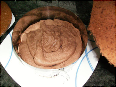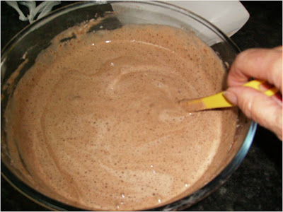 He puesto la mitad de la nata montada, en una manga pastelera y dejado reposar en la nevera, y a la otra mitad añadir el cacao puro y batir unos segundo, poner también en una manga y dejar reposar en la nevera  un 1/4 de hora