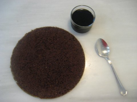 1. En pasos sucesivos, bañar una de las capas de bizcocho con un poco de almíbar.