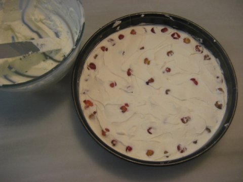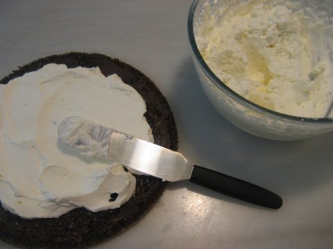 3. Rellenar con la mitad de la nata espumada y la mitad de las cerezas. Tapar con otra capa de bizcocho.