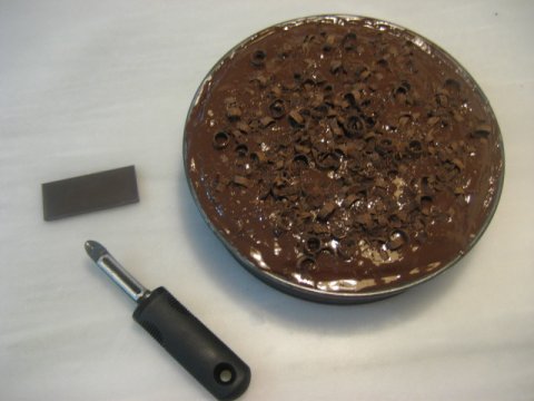 5. Adornar con virutas sacadas de una tableta de chocolate con un pelador. Y retirar el molde.