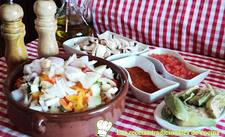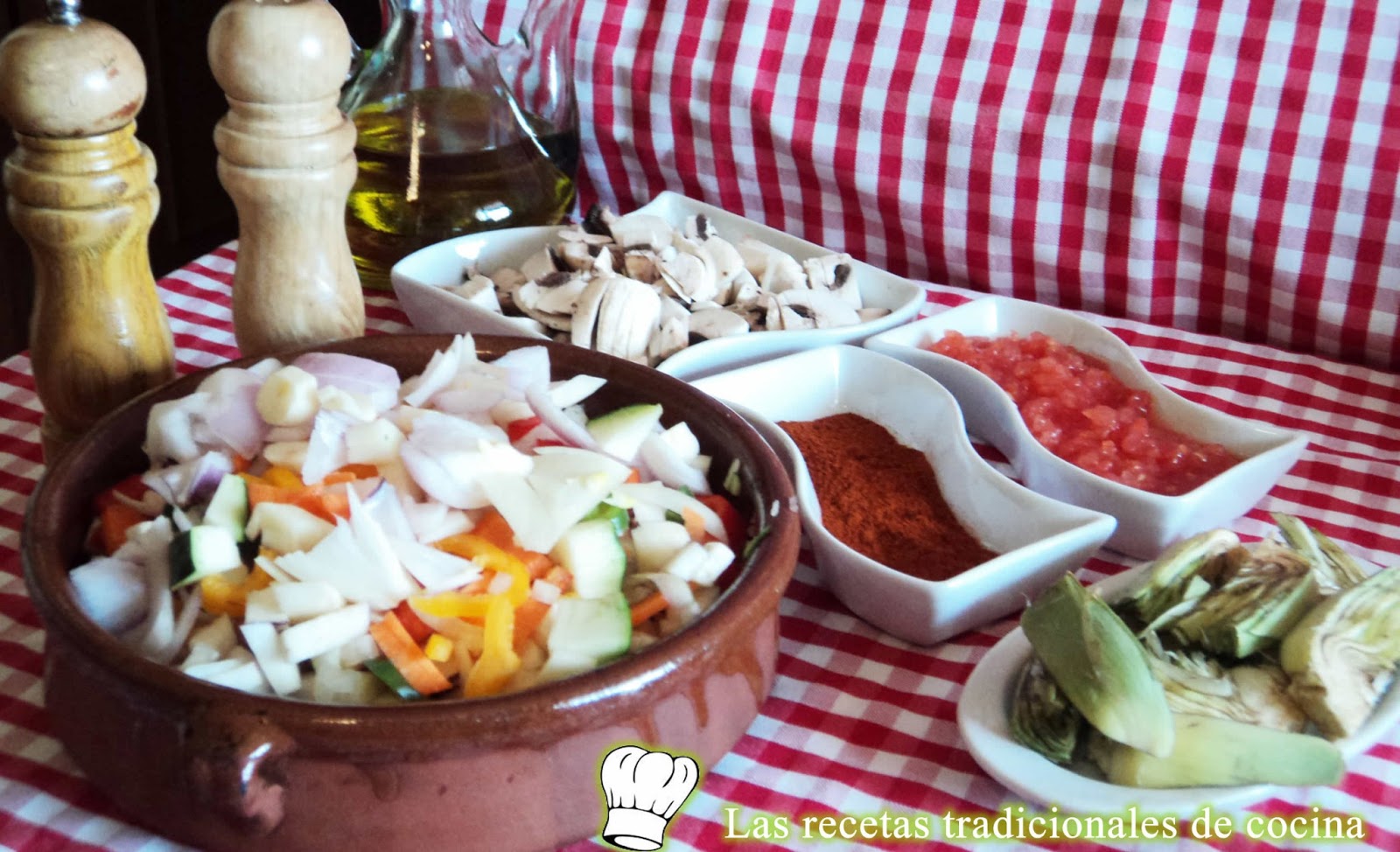 Lava todas las verduras y las picas, excepto la alcachofa que la cortas a cuartos, los champiñones los laminas.