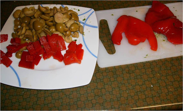 Cortamos las aceitunas en cuatro partes y los pimientos los cortamos en trozos pequeños.