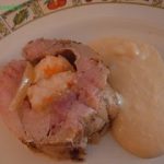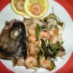 Lubina salvaje en cama de verduras cubierta de mar y tierra