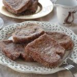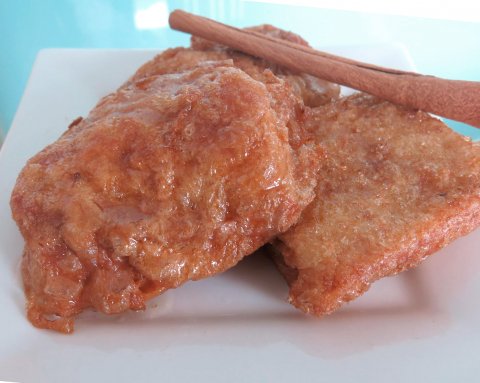 11. Y ahora viene la parte más importante. Cuando saques las torrijas del fuego debes rebozarlas de azúcar por ambas caras, embadurnándolas con las manos. Luego retirar la torrija en un plato aparte. El calor del aceite hará que el azúcar se derrita y se convierta en una especie caramelo o almíbar típico de las torrijas. Si quereís que las torrijas sean de chocolate hacer la misma operación con el Nesquik, Cola-Cao o cacao en polvo. Hay gente que le hace un almíbar aparte y se lo echa por encima a las torrijas. Es cuestión de gustos, pero yo prefiero el sabor que le da el azúcar o el chocolate.