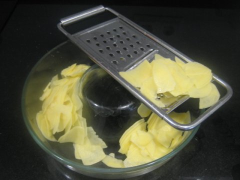 1. Pelar, lavar y cortar en láminas las patatas. Pelar y picar la cebolla. Salar al gusto.
