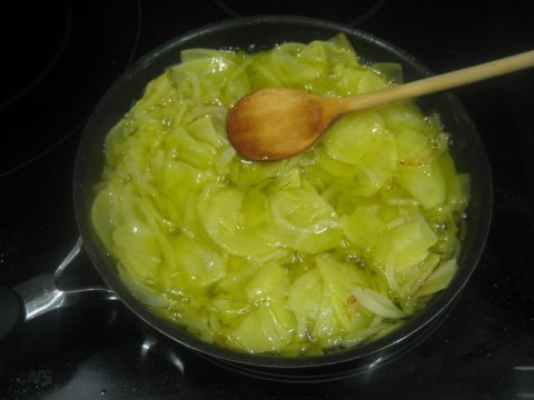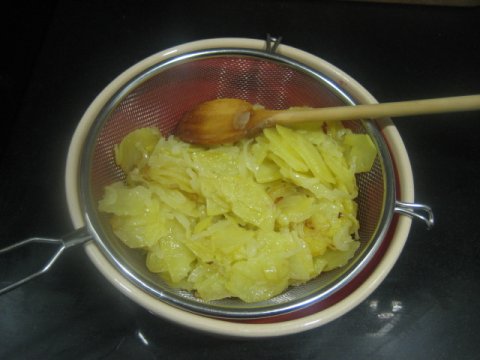 a. Escalfar en abundante aceite a fuego suave, y sumergidas, la patata y la cebolla hasta que estén tiernas. Escurrir o colar, para retirar el aceite.