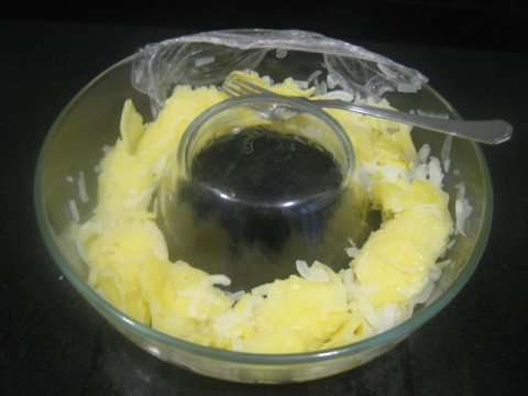 b. O… Cocer a media potencia la patata y la cebolla con las microondas, hasta que estén tiernas, en un recipiente de cristal y circular, tapado con film plástico. En esta ocasión veinte minutos, a media potencia, con volteo a  la mitad.