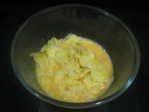 Verter la patata y la cebolla caliente sobre los huevos batidos.