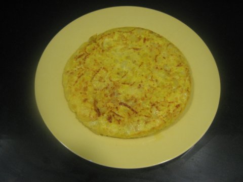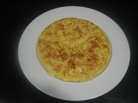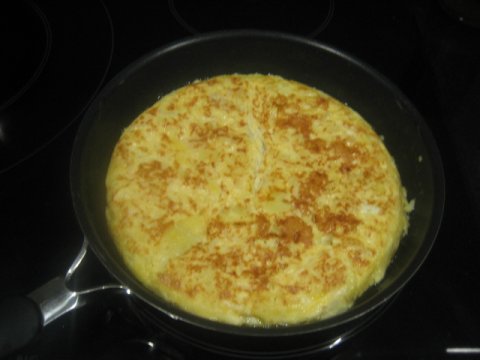4. Verter en una sartén con dos o tres cucharadas de aceite y cuajar los huevos, primero por una cara, y, tras dar la vuelta a la tortilla, por la otra cara. Ambas caras deben quedar doradas, y el interior jugoso, tanto como guste al que se va a comer la tortilla, (he visto tortillas que son un saco que guarda en su interior los huevos líquidos y otras que son una piedra, ambas deliciosas, cada una para el que la hacía).