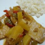 Cinta de lomo de cerdo alemana salteada con piña en la cocina francesa de una española