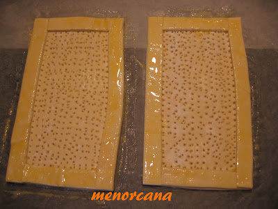 Preparar la cama haciendo dos tartaletas con el hojaldre, pinchar con un tenedor el centro y pintar los bordes con huevo batido.