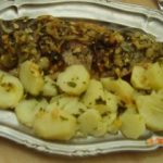 – Coloca la mitad en la fuente del horno y encima las patatas con el laurel, y sobre ellas la trucha.