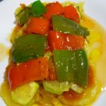 Pela las patatas y córtalas en rodajas de medio centímetro. El calabacín puedes dejarlo con la piel ya que es finita y no molesta. También córtalo en rodajas de medio centímetro. El pimiento rojo suele tener la piel un poco gruesa y por eso prefiero pelarlo con un pelador de patatas. Córtalo en tiras anchas. El pimiento verde no tiene la piel tan gruesa así que le puedes dejar la piel. También córtalo en tiras anchas.