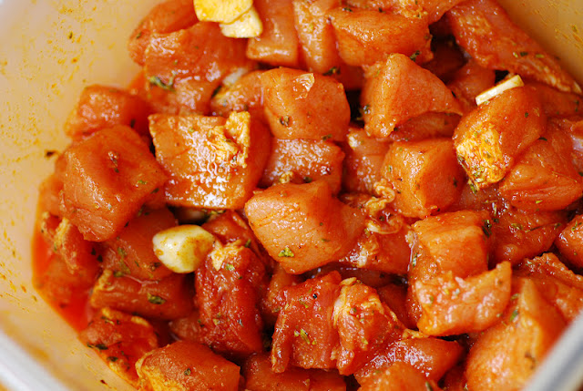 Lo colocamos en un recipiente hermético y añadimos sal, orégano, 4 cucharadas soperas de pimentón dulce, 1 cabeza de ajos sin piel cortados en láminas , un buen chorro de vino blanco y otro de aceite de oliva virgen.